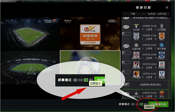 可以同时播放两场赛事视频,也可用于同时播放四场四分之一决赛的赛事视频。