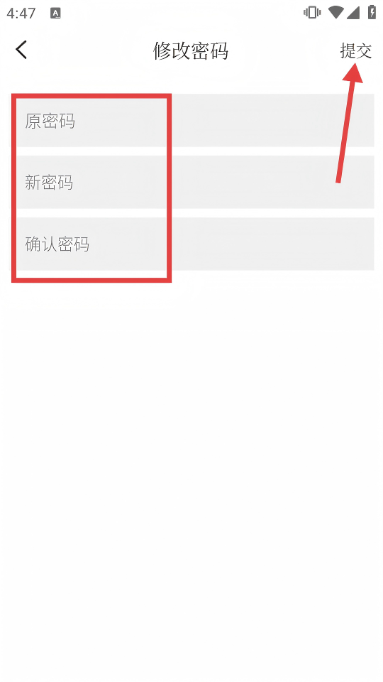 4进入密码更新界面后,按顺序输入当前使用的密码、想要设置的新密码以及再次确认该新密码,最后点击提交按钮,即可完成密码的更新操作。