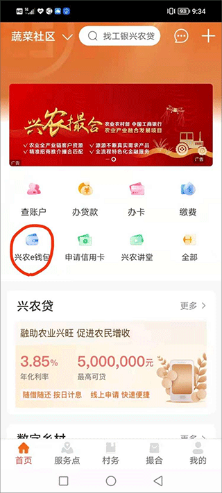 1、打开并登入,进入首页中点击“兴农e钱包”