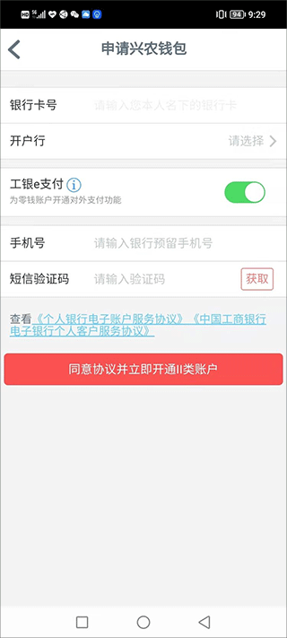 4、输入一张一类卡的卡号及相关信息,获取并填写验证码后,点击下方的“同意协议并立即开通二类账户”按钮。