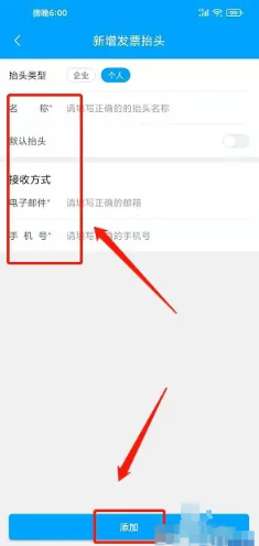 4接下来进入添加新发票抬头的页面,依次选定抬头类别、填写抬头全称、电子邮箱和手机号码后,点击“添加”按钮完成操作。