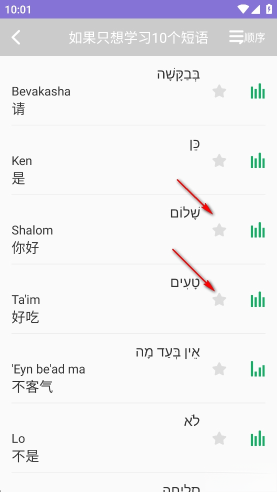 《天天希伯来语》是长沙市云福网络科技有限公司打造的希伯来语零基础学习平台。该平台收录了大量常用的希伯来语词汇与句子,涵盖酒店、购物、时间、数字、旅游、颜色、天气等丰富场景的实用语句。用户可以通过点击跟读功能练习发音,还能将常用语句收藏起来,方便随时查看与使用。