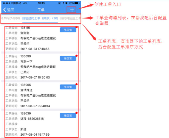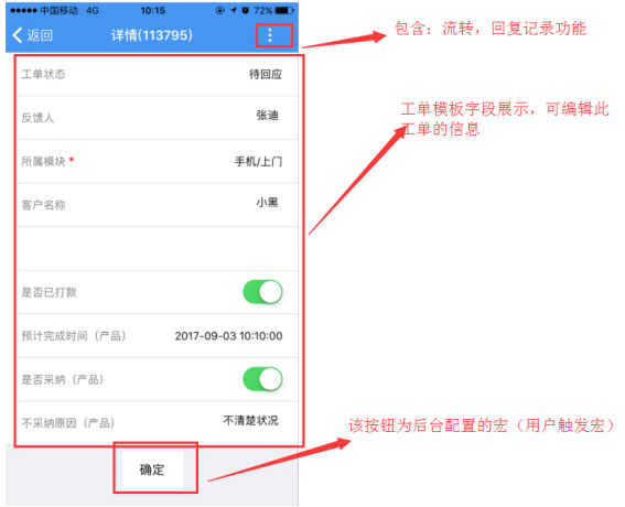 每个工单的详情页面,展示内容是该工单对应的模板字段;后台会对哪些字段可编辑、哪些字段可见以及宏的显示或隐藏进行配置,系统会依据这些后台配置来呈现符合要求的内容(具体可参考帮我吧后台与工单相关的设置项)。