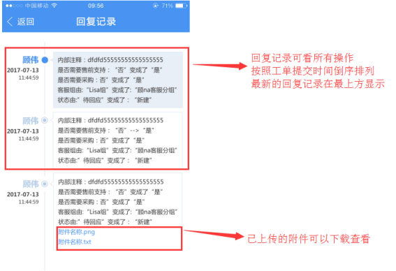点击回复记录选项,能够查看每次工单处理过程中的操作轨迹以及对应的回复信息,其中每条回复记录所附带的文件也都能一目了然地呈现出来。