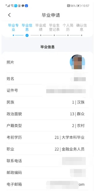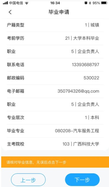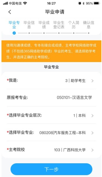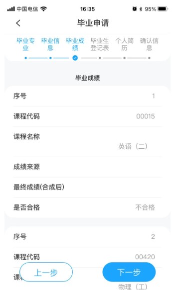 5、完成信息核对,确认无误后,点击“下一步”按钮,进入毕业成绩页面