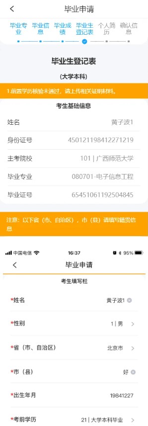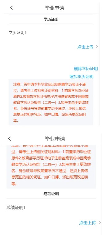 4、若考生申请本科毕业,系统将对其前置学历开展认证工作;若认证未通过,考生需上传学历证明材料;待考生本科毕业且同意学历认证后,需完成在线学历认证流程。