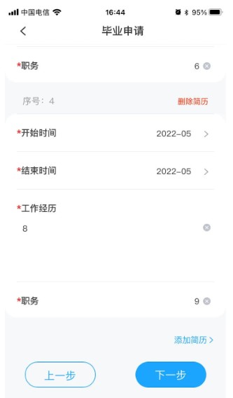 9完成简历信息的填写操作(可通过【添加简历】按钮创建新的简历条目,也可利用【删除简历】按钮移除当前展示的简历内容),操作完成后点击【下一步】按钮继续流程。