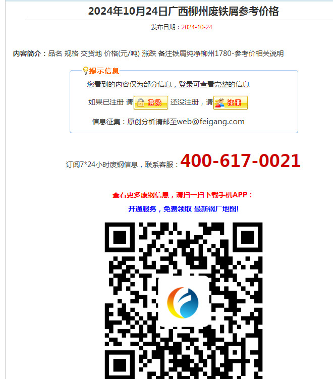 《废钢网使用指引》 废钢价格等信息可随时查询,作为大宗商品及相关产业的数据服务商,我们涵盖废钢、汽车拆解废料、工地废钢、铸造废钢、国际废钢、冶金渣、废有色金属等多个类目。平台每日更新资讯超千条,内容涉及价格