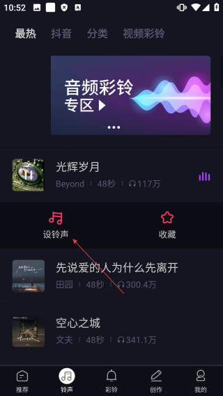 3、进入铃声操作选项后,点击【设铃声】按钮,即可打开铃声设置方式的选择界面。