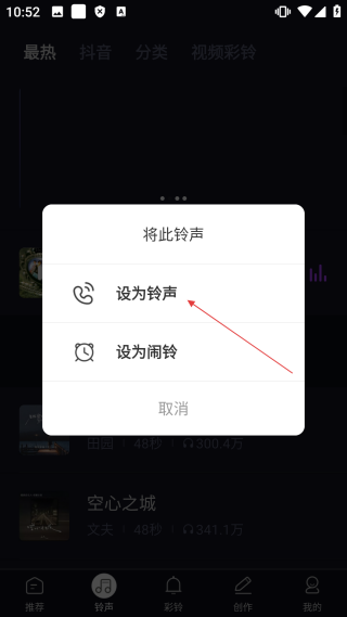 4、进入铃声设置方式的选择界面后,点击【设为铃声】按钮,就能完成铃声的设置操作了。