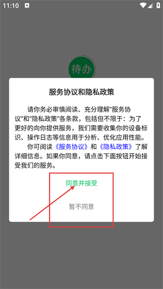 1第一次使用待办功能时,要先点击【同意并接受】按钮,确认同意相关服务条款与隐私规则,之后才能进入功能界面。