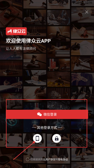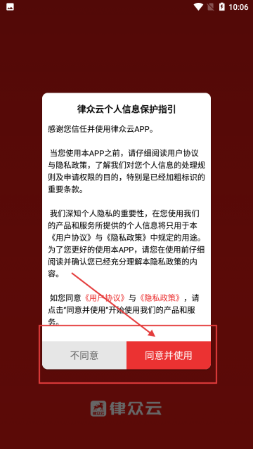 1在启用律众云服务前,您需要仔细阅读《用户协议》和《隐私政策》,只有点击【同意并使用】按钮后,才能正式进入软件开始使用。