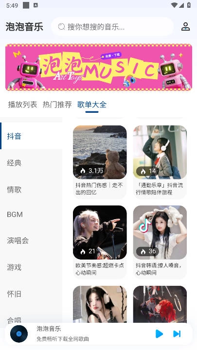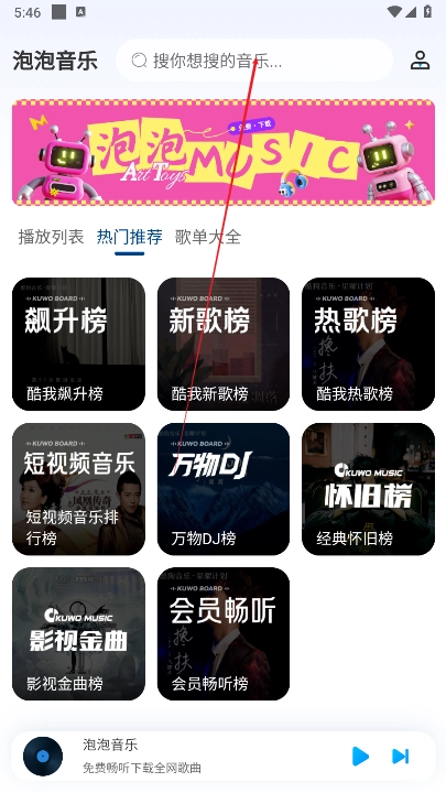 海量曲库:泡泡音乐曲库资源丰富,覆盖流行、摇滚、古典、电子、民谣等各类音乐类型,能满足不同用户的多元需求,各类风格的歌曲都可在此找到。