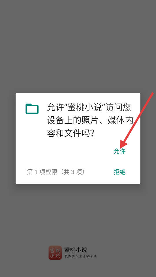 1、当出现“蜜桃小说”的权限请求时,点击【允许】,从而赋予它访问设备照片、媒体内容及文件的权限。