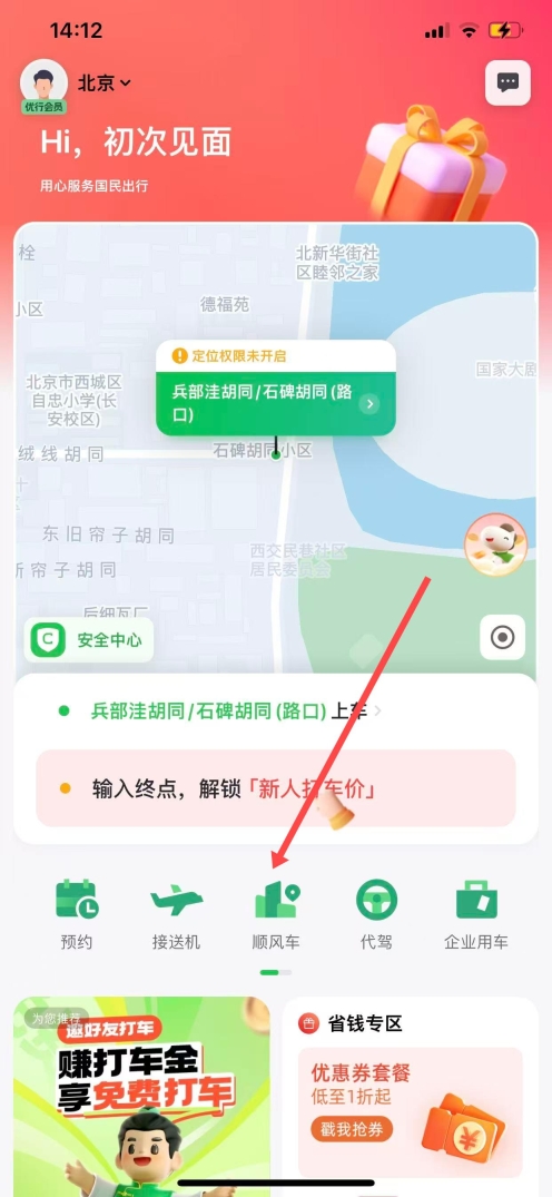 1打开曹操出行应用程序,待主界面加载完成后,找到并点击顺风车相关的功能入口,即可进入对应的服务页面。