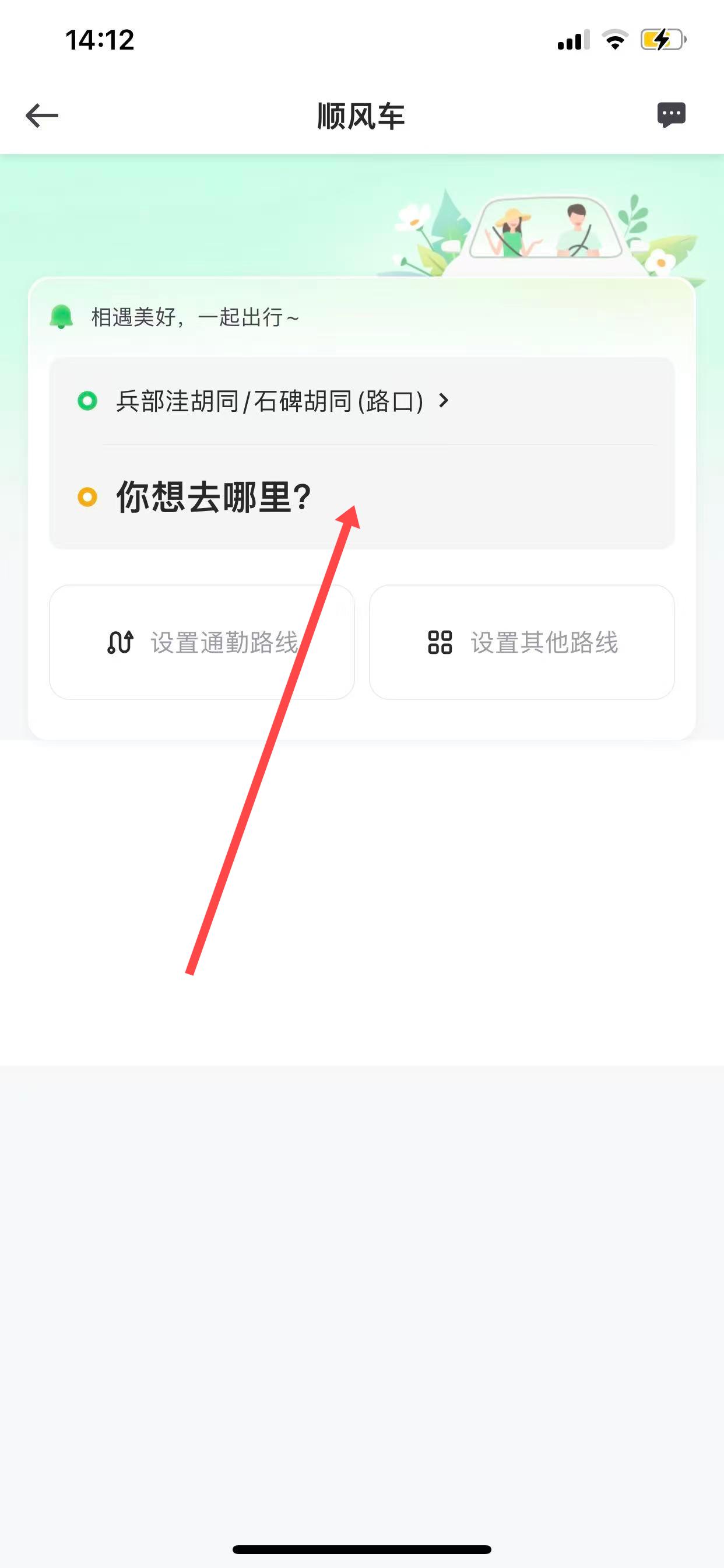 2、进入顺风车服务页面后,找到“你想去哪里”的输入框并点击,接着输入本次行程的目的地。