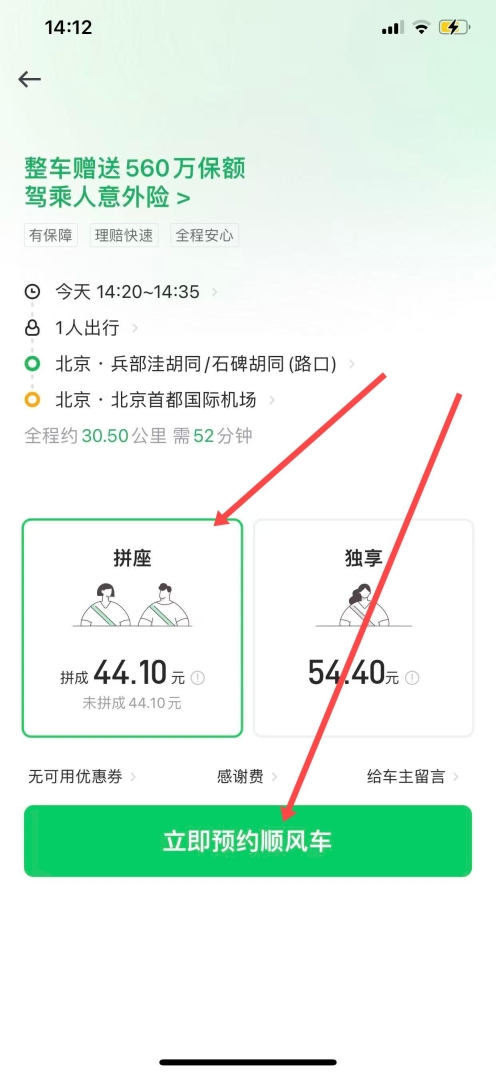 4接下来,选定拼车的乘车类型,查看该选项的具体费用后,点击“马上预约顺风车”的按键,完成订单提交并等候司机确认接单就可以了。