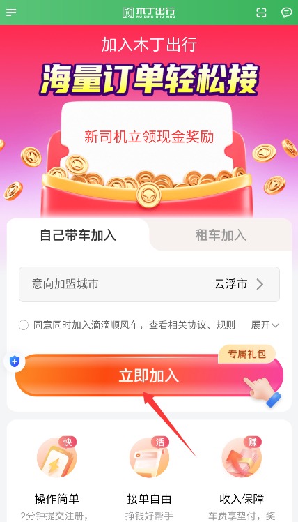 3、可依据车辆实际状况挑选自带车辆或租赁车辆的模式,确定好城市后点击加入按钮,就能开启接单流程了。