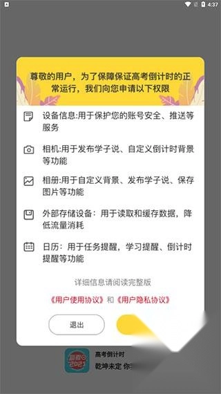 1、先安装高考倒计时软件,待安装完成后点击软件图标将其打开,接着阅读相关协议并授予手机所需权限,随后即可进入软件首页。