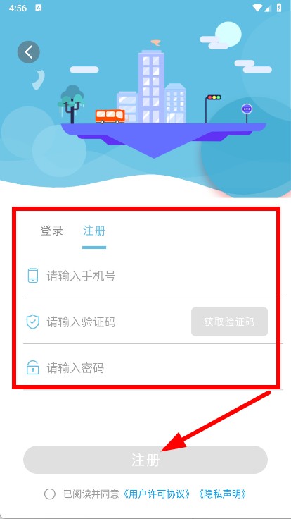 4、进入注册页面后,请按顺序填写手机号、验证码与密码,随后点击注册按钮,即可完成注册流程。