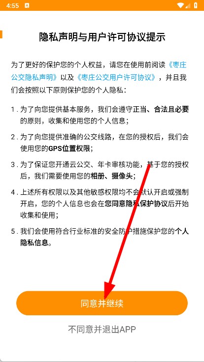 1启动枣庄公交应用后,在弹出的隐私声明和用户许可协议确认界面,点击同意相关条款以进入下一步操作。