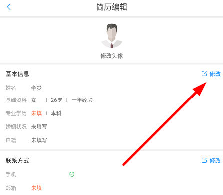 1打开对应页面后,找到并点击用于修改个人履历信息的功能按钮。