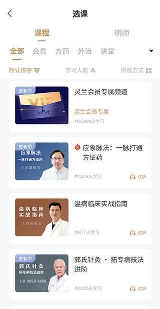 3、还有另一种方法,点击首页的【选课】按钮,就可以直接进入课程列表,这里分为明师、会员、方药、外治、讲堂等多个类别。