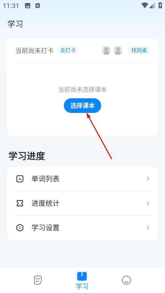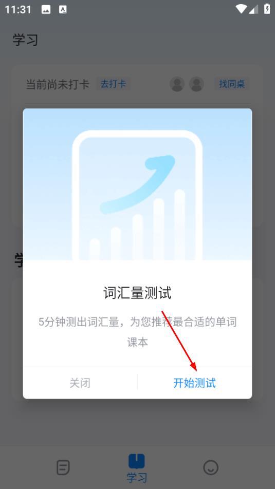 1. 在学习界面,点击选择教材,随即弹出词汇量测试的弹窗。
