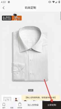 3在衬衫的商品详情页面,找到位于页面底部的“立即定制”按钮并点击,即可进入后续的定制环节。