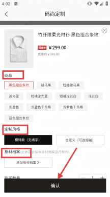 4、进入码尚定制页面后,先挑选心仪的商品、选定定制风格并填写身材档案,待所有信息确认无误,点击【确认】按钮即可完成定制流程。