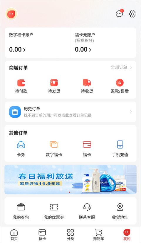 1、首先打开福卡商城,在我的功能,点击副卡账户;