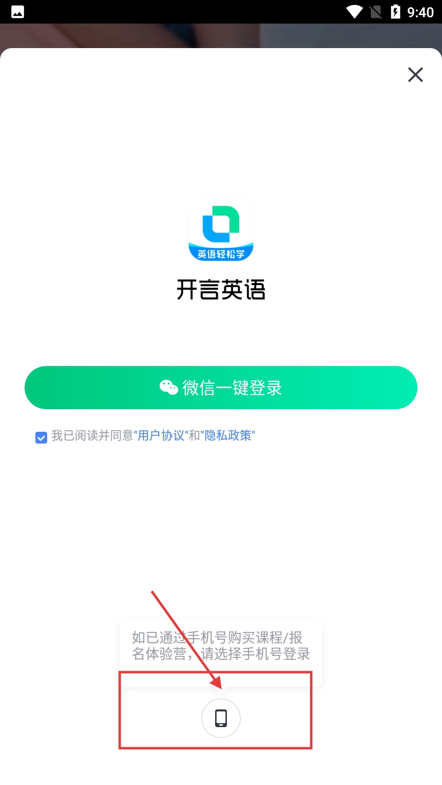 2、在登录页面,若您曾用手机号购买过课程,可点击底部的手机图标,选择手机号登录的方式。