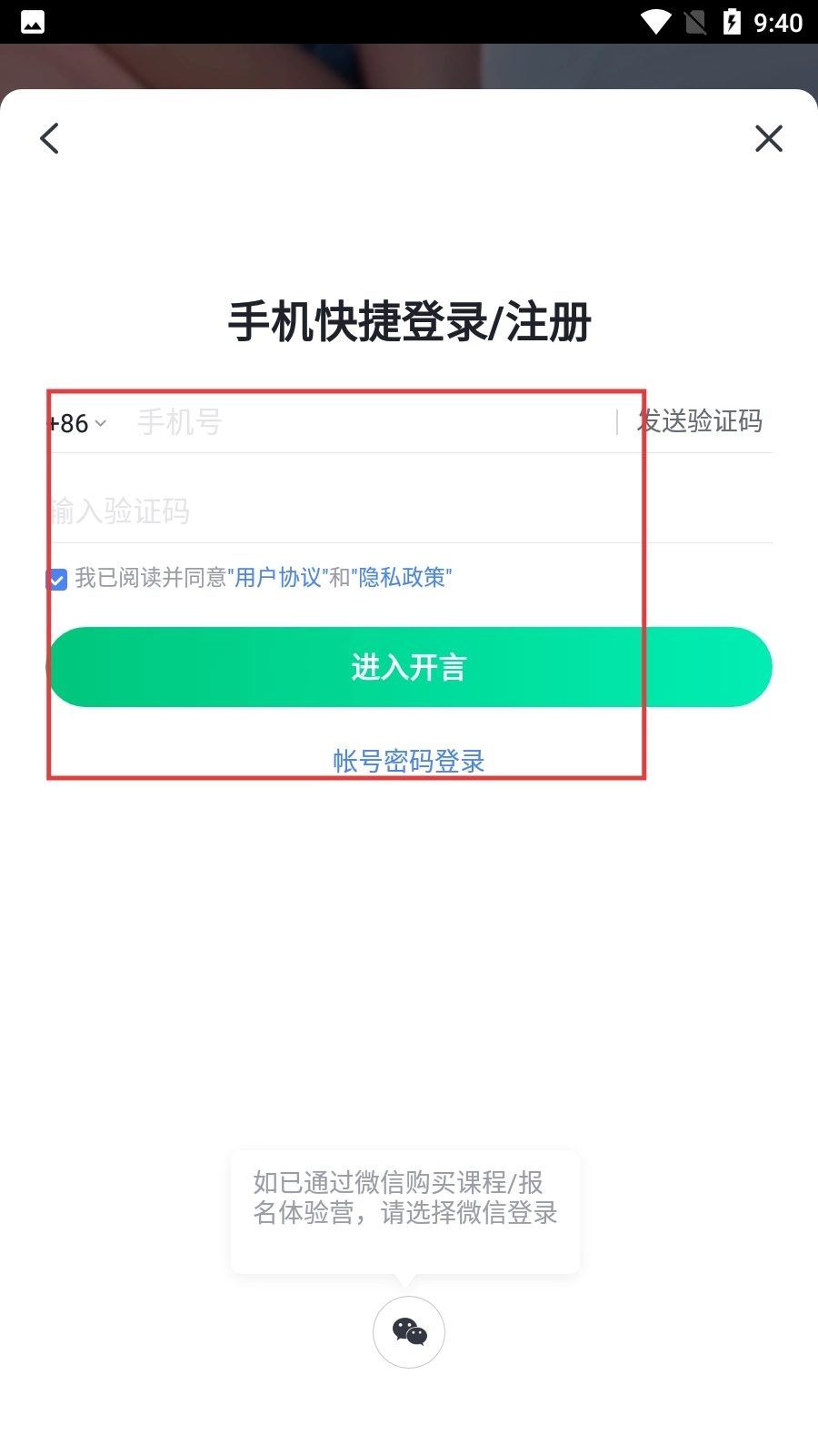 3、打开手机快捷登录/注册界面,填写【手机号码】,获取并输入验证码,勾选相关协议后点击【进入开言】按钮,就能完成登录或注册操作。