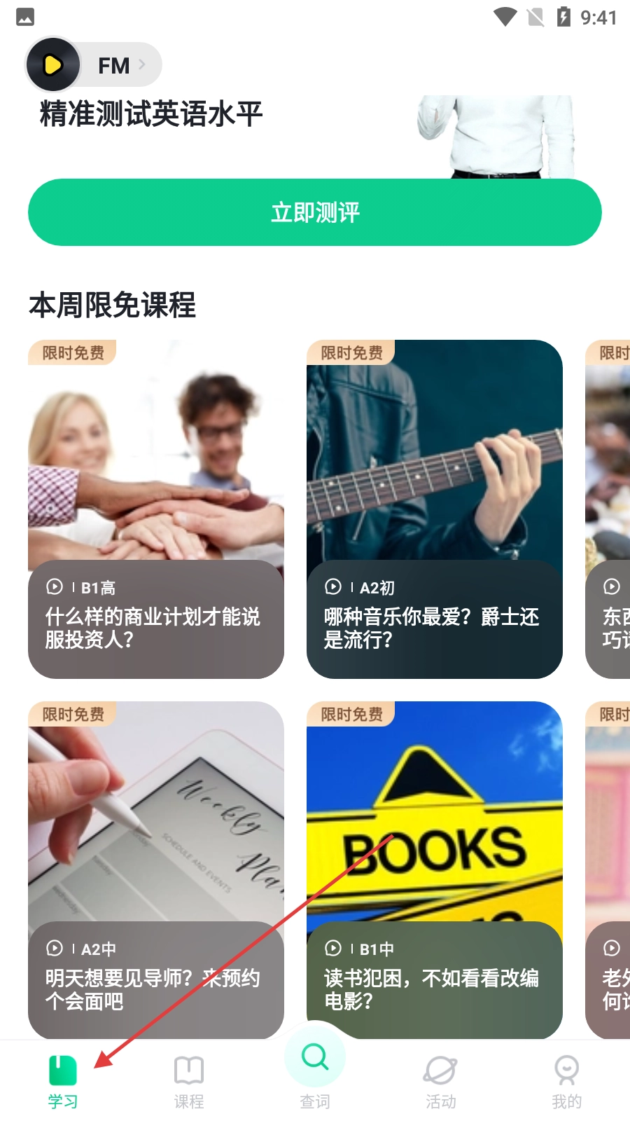 登录后进入主界面,您可以先点击【立即测评】来精准测试自己的英语水平,也可以查看【本周限免课程】,从中挑选适合自己的课程进行学习。