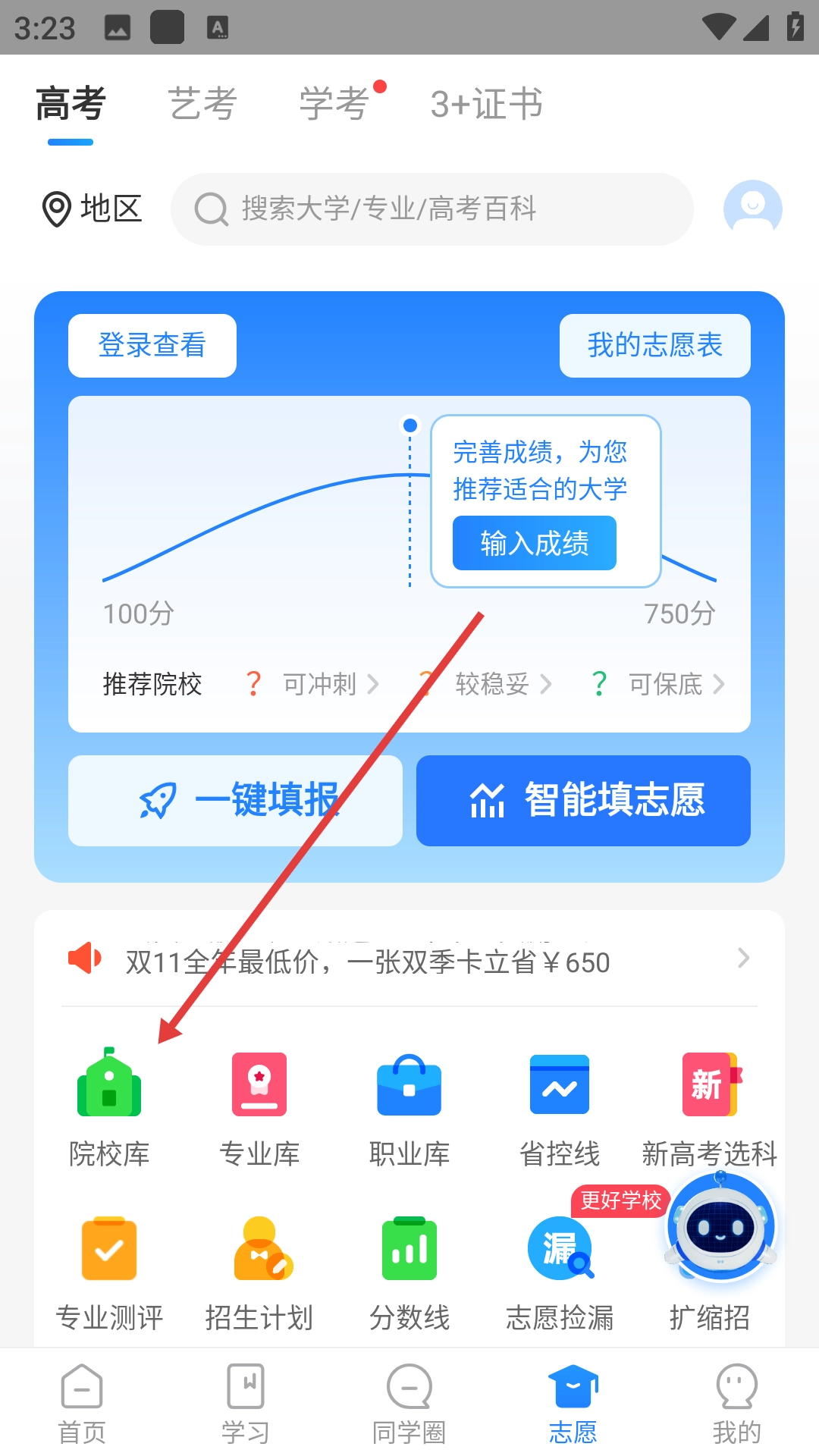 2、在志愿页面点击【院校库】,进入院校库页面。