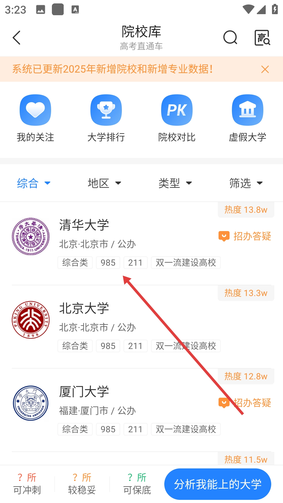 3、在院校库页面找到并点击【清华大学】,即可进入该院校的详情页面。