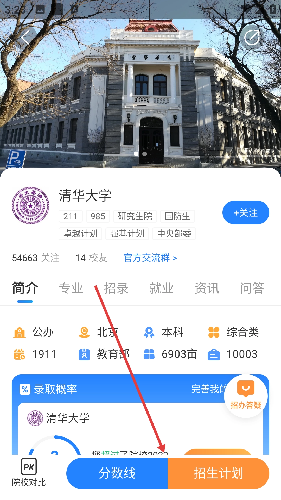 在清华大学的详情页面,点击【分数线】或【招生计划】选项,即可查看相应的信息。
