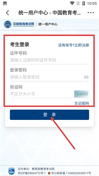 4、在考生登录界面输入【证件号码】【登录密码】【验证码】后,点击【登录】按钮,即可查询成绩。