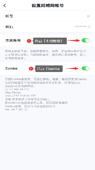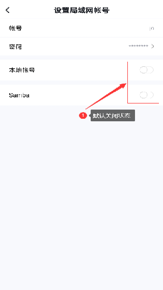 3. 完成设置后回到功能管理界面,这时能看到本地账户和Samba服务都还没激活,服务开关是灰色的,得手动打开。