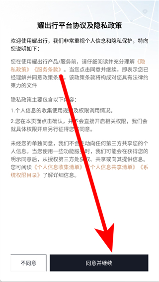 1、打开耀出行应用,在平台协议与隐私政策页面点击“同意并继续”按钮。