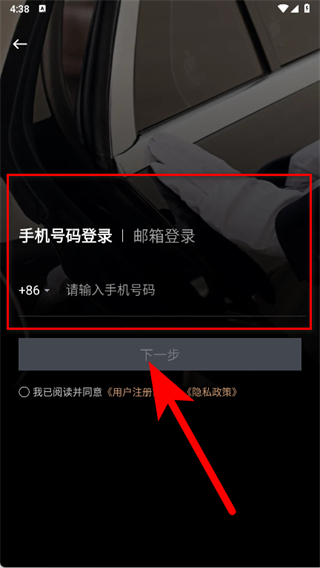3、选择手机号码登录方式,输入对应的手机号码,勾选相关选项后,点击“下一步”按钮。