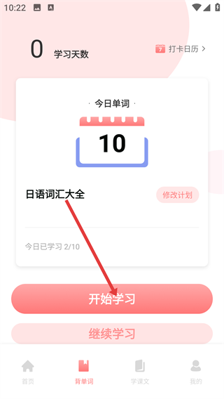 1、打开日语学习首页后,点击底部导航栏中的【背单词】选项,即可进入单词学习计划页面。