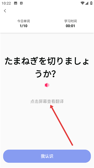 3在词汇学习界面,按照指引点击屏幕相应位置,即可查看当前显示的日语语句所对应的译文信息。