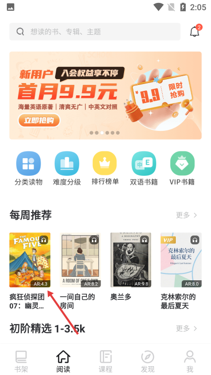 1、书架页点击底部【阅读】,进入阅读推荐界面。