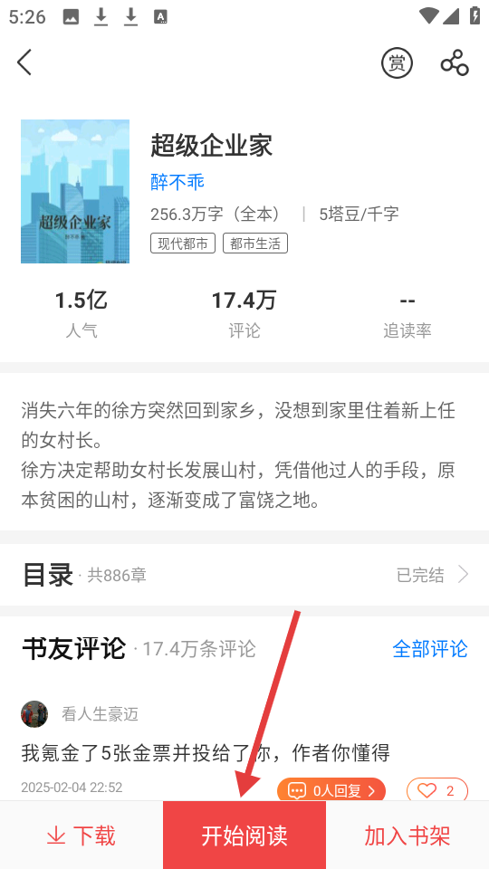 4、在小说详情页点击【开始阅读】,进入阅读界面。