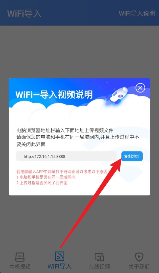 3、WIFI导入文件:选择WIFI导入,通过浏览器上传视频至播放器中。