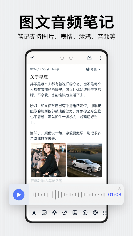 这款笔记应用支持多种记录形式,包括文字、图片和语音等,还具备分类整理、标签筛选与搜索功能。用户能随时对笔记进行查看、编辑和删除操作,有效保障个人信息安全。