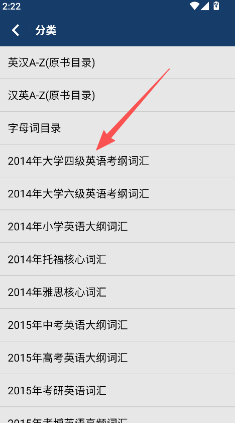 2、点击分类,选择考试词汇,进入学习。