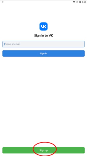 2、打开VK应用,进入登录页面后,点击页面下方的“Sign up”选项