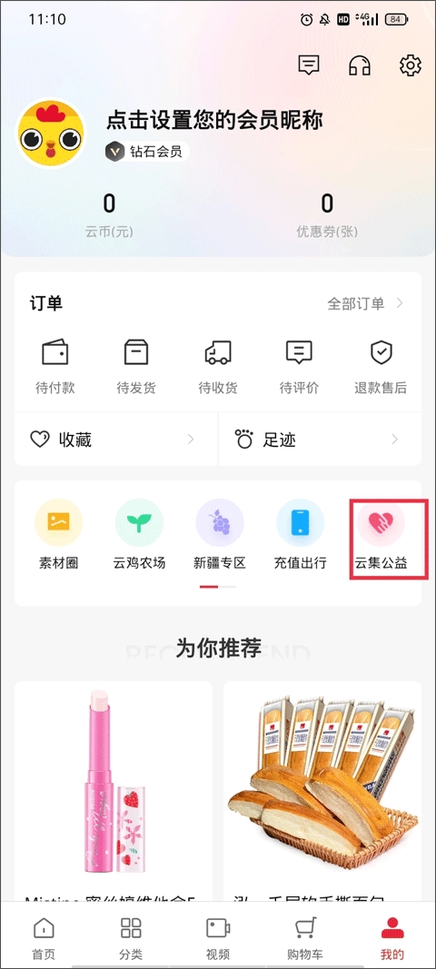 1、还是切换到菜单栏【我的】界面,在右边有一个“云集公益”功能按钮,点击它;